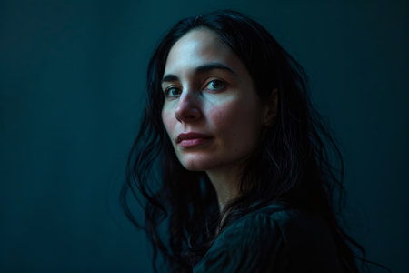 A young woman with long, dark hair looks thoughtfully into the distance against a blurred blue background.