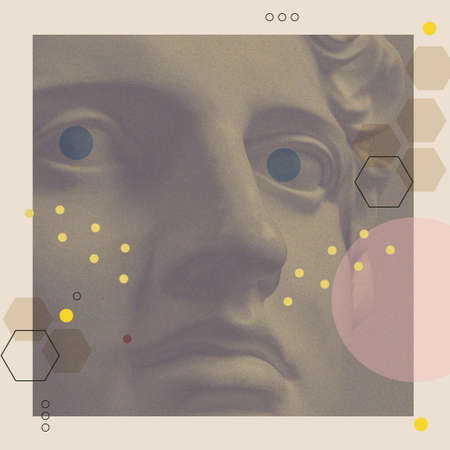 Collage with plaster antique sculpture of human face in a pop art style. Modern creative concept image with ancient statue head. Zine culture. Contemporary art poster. Funky minimalism. Retro design.