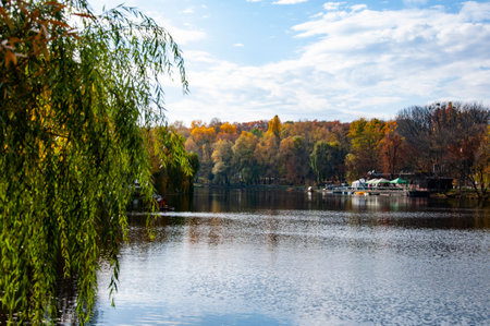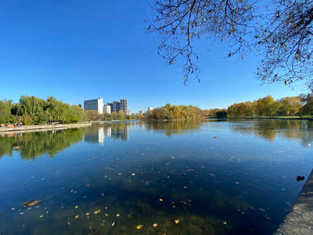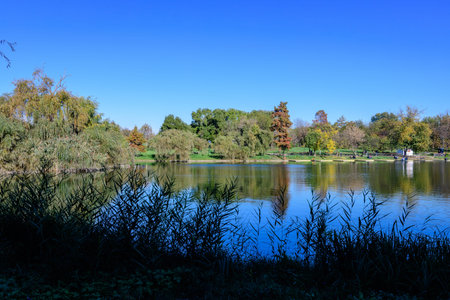 Landscape with many large green and yellow old trees near the lake in a sunny autumn day in Tineretului Park in Bucharest, Romania