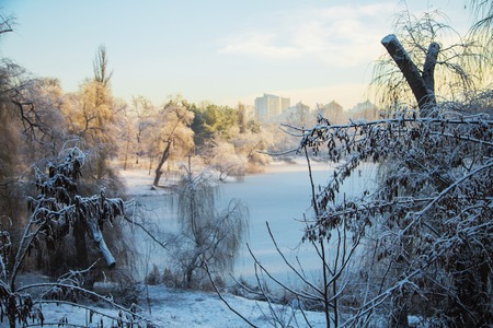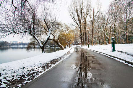 Snow time winter landscape at Herastrau park, Bucharest. Snow is falling, cold day. Beautiful day