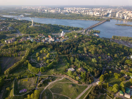 A birds eye view, panoramic view from the drone to the Botanical Garden, the Motherland Monument , Dnieper River, Paton Bridge in the city of Kiev, Ukraine