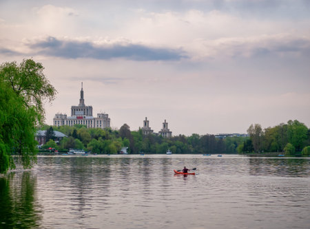 Bucharest, Romania - 04.15.2022: Man in a kayak paddling on the lakeHerestrau in King Mihai I park, Bucharest.