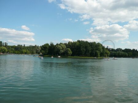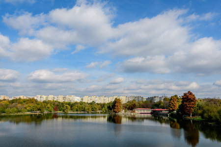 The Public Park called Herastrau from Romania, Bucharest with lake, blue sky, clouds, green trees