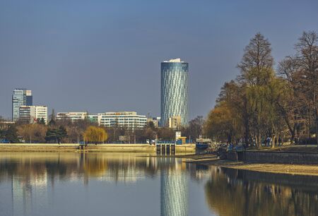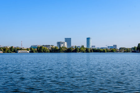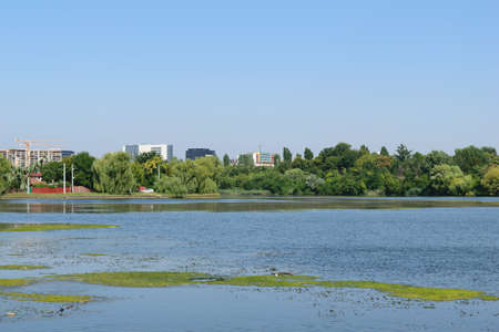 Plumbuita lake in Colentina district of Bucharest. Calm lake with vegetation, office buildings, flats and cranes in the background.