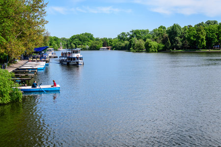 Bucharest, Romania - 15 May 2021: Landscape with white boat on Herastrau lake and large green trees in King Michael I Park (Herastrau) in Bucharest, Romania, in a sunny spring day
