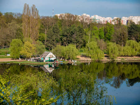 Boat station house on the lake shore in the city park. The house and the forest around it are reflected in the water of the lake.