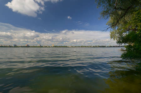 Panoramic view of the left bank of Dnieper River. Dnieper. Ukraine. Reflection of the sky with clouds on the water surface.