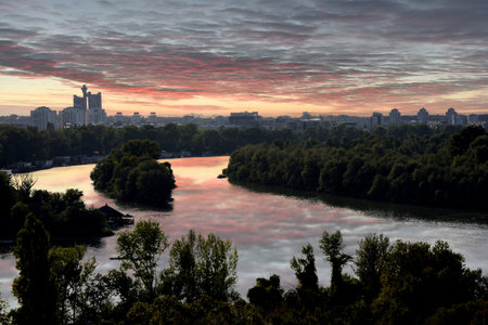 Panorama city view during sunset over Belgrade, Serbia at confluence of two main rivers, Danube and Sava