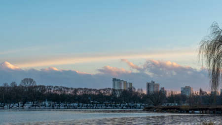 Modern residential area in city near lake with the first snow. Tall residential buildings are visible behind the trees. Urbam concepts.