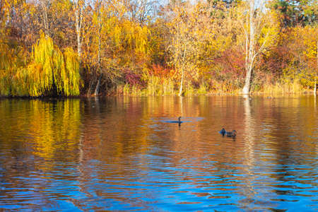 autumn sunny landscape. Lake in the forest with swimming ducks.