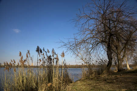 Sunny autumn evening on the blue lake with yellow trees. The Ivanki village in Cherkasy region, Ukraine