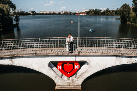 Ivano-Frankivsk, Ukraine, August 7, 2021:A couple of brides and grooms are standing on a concrete-metal bridge over the lake, the bridge connects the land and the island, drone photo.