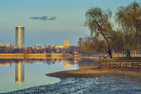 Bucharest, Romania - March 09, 2013: Idyllic scenery in Herastrau park with buildings reflections on the lake surface on a spring serene morning.