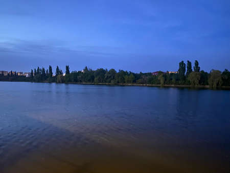 Night landscape view of blue lake with trees and blue sky reflecting on it