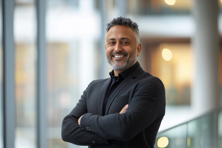 Confident businessman smiling in a modern office setting
