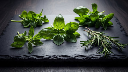 Fresh basil and rosemary sprigs are arranged on a dark slate surface. Clear details and vibrant colors enhance...