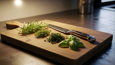 Close-up of skilled hands expertly chopping fresh herbs on a wooden cutting board. A cozy kitchen ambiance enhances the preparation of a delicious meal, highlighting culinary artistry.