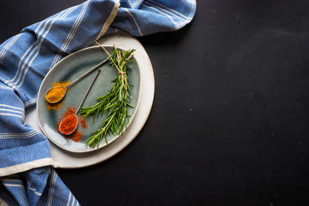 Various herbs spices with place for text isolated dark background, plate. Top view.