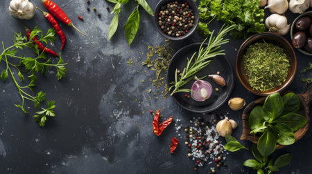 A top view of a dark kitchen counter filled with fresh herbs and spices, including basil, rosemary, and chili peppers. The image is rich in texture and color, ideal for themes related to cooking, ingredients, and culinary arts.