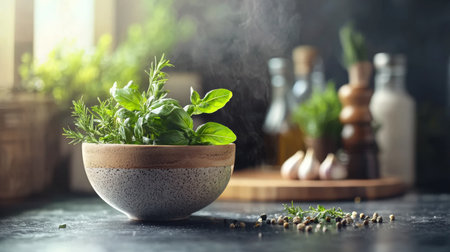 A rustic kitchen scene featuring a ceramic bowl of fresh basil and rosemary leaves with soft natural light and culinary elements in the background.