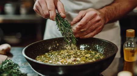 A person adds fresh herbs to a bowl of food, enhancing flavor while cooking on a kitchen counter,.