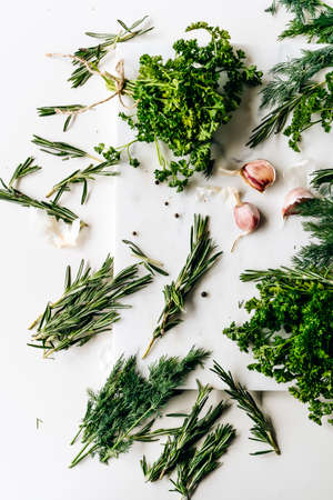 Flat-lay of various fresh green kitchen herbs. Parsley, mint, savory, basil, rosemary, thyme on white background, top view. Spring or summer healthy vegan cooking concept