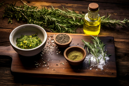 A beautiful arrangement of fresh herbs and spices on a wooden board, showcasing vibrant colors and organic ingredients, perfect for culinary creativity.