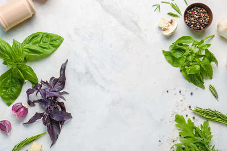 Different fresh herbs with spices on light background