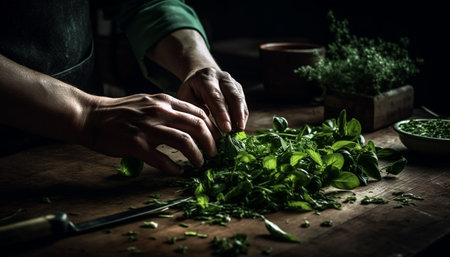 Dedicated chef carefully preparing fresh herbs in a bustling kitchen, capturing culinary artistry and passion for flavor creation. Generative AI