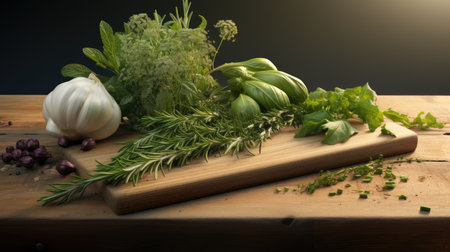 Fresh herbs and spices on a wooden board, ready for cooking. Aromatic ingredients for culinary delights.