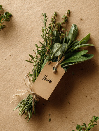 A neatly arranged herb bundle with a label tag resting on a beige backdrop, showcasing fresh, aromatic herbs ready for culinary use or decoration.