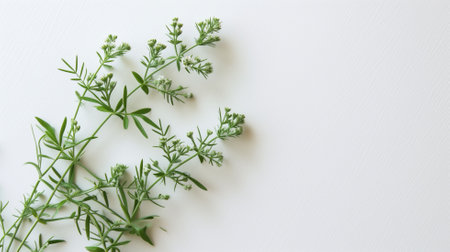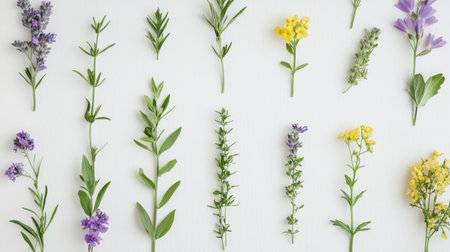 A stunning collection of fresh herbs and wildflowers elegantly arranged on a light background, perfect for various creative projects and nature-inspired designs.