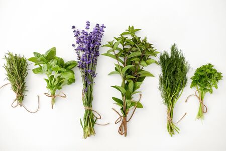 gardening, ethnoscience and organic concept - bunches of greens, spices or medicinal herbs on white background