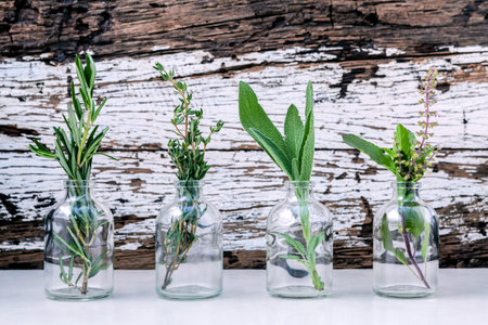 Peppermint, rosemary, wintergreen, thyme and sage in five glass bottles