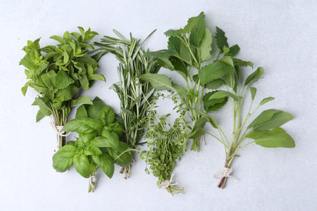 Vibrant array of fresh herbs, beautifully arranged on a grey surface, ideal for culinary uses, food styling, and inspiration for healthy cooking. Perfect for kitchens and recipes.