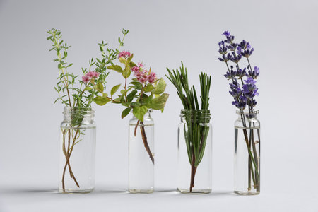 Bottle of essential oil with herbs lavender flower, rosemary, sage, thyme and peppermint set up on white background.