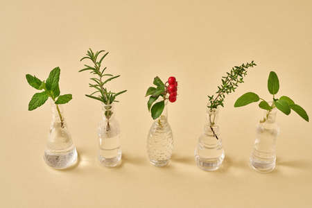 Spicy fresh herbs with medical transparent glass bottles, against a light background at the bottom. Nutrition and alternative medicine.