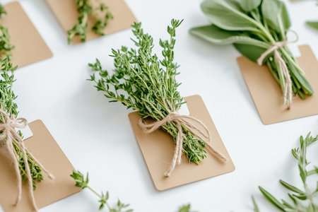 Freshly gathered herbs are artfully displayed on rustic craft labels, showcasing their vibrant green colors and inviting aromas, perfect for culinary use or home decor.