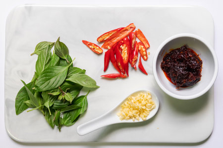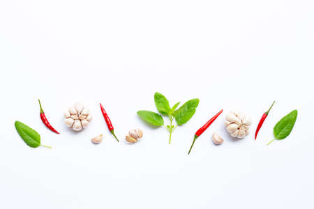 Ingredients herb and spice, holy basil, chili and garlic on white background. Healthy eating concept