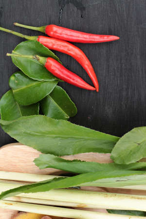 Ingredients of Thai Cuisine, Thai spicy Tom Yam soup with galangal,kaffir lime leave, chili, lemongrass on wood background.