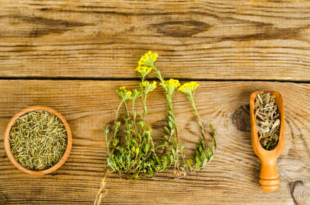 Fresh and dry shredded medicinal herbs, medical capsules.