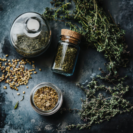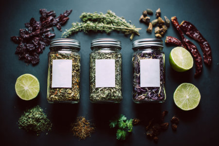 Various jars filled with herbs and spices are displayed on a dark textured surface showcasing a culinary arrangement for cooking.