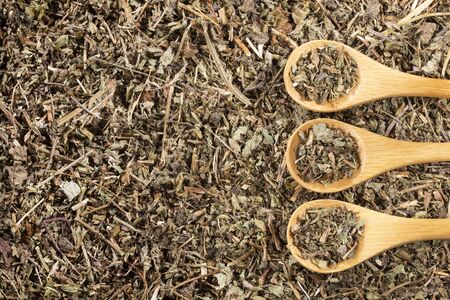 Assortment of dry tea in spoons and bowl on wooden background. Top view.