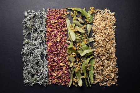 Explore a vibrant assortment of dried plants captured from a top down view. This beautiful arrangement showcases various herbs, spices, and petals, perfect for culinary uses or decorative purposes.