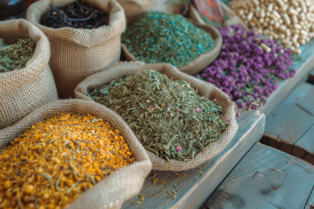 A collection of bags containing different varieties of herbs, neatly arranged and ready for use, Close-up shot of dried medicinal herbs, AI Generated