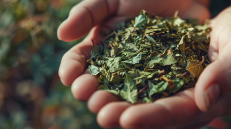 A photograph of a handful of dried herbs capturing the contrast between the rough and smooth leaves creating a visually interesting composition