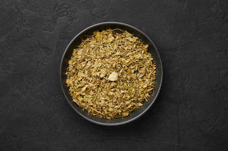 Dry Kasuri Methi or Fenugreek in black bowl on dark slate table top. Dried Fenugreek is the popular seasoning of many asian cuisines.