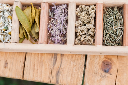 Alternative health care and herbal medicine. Dried various Chinese herbs in wooden box