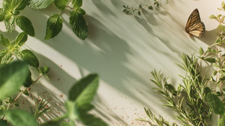 A serene arrangement of fresh herbs with a beautiful butterfly on a light background, casting shadows that enhance the tranquility of this natural composition.