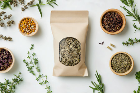 Paper packaging mockup is surrounded by dried herbs, plants, and herbal medicine ingredients on a white table